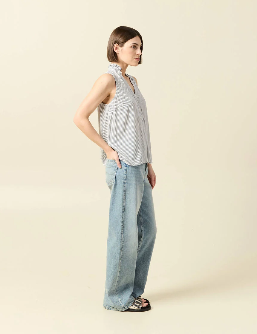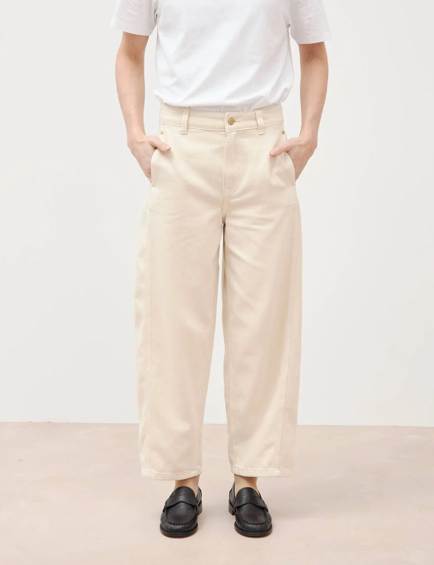 La matière est la star. Côté fibres, priorité au coton bio et au coton recyclé, souvent mêlés à du Tencel/Lyocell pour la douceur et le tombé, ou à du lin et du chanvre pour la fraîcheur. Les délavages sont traités pour limiter l’eau et l’énergie, les boutons en métal recyclé et les étiquettes en papier responsable complètent l’ensemble. Le toucher reste souple, la tenue impeccable, avec ces textures légèrement grainées qui signent un jean de bonne facture.