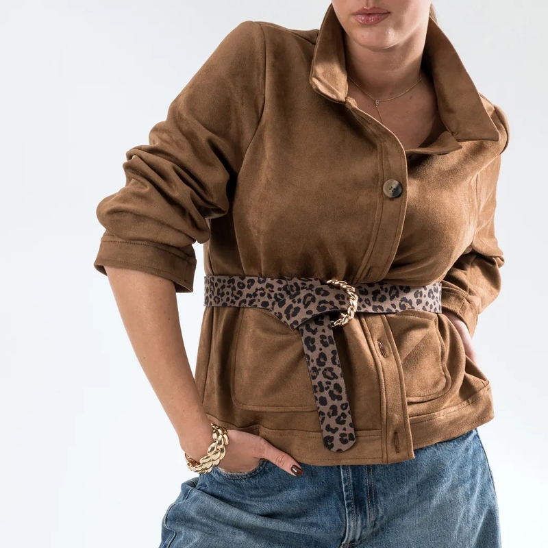 La ligne s’achève en tempo coordonné: sacs suédés formats hobo ou cabas, sac banane léopard pour signatures mains libres, ceintures maxi clous ou effet léopard afin de ponctuer la taille. Les petites maroquineries suivent les nuances camel & chocolat, faciles à assortir au vestiaire. L’allure? Sensuelle sans surcharge, citadine sans rigidité. Boulevard Macadam dessine une féminité mobile qui préfère la précision au superflu. Du bureau au dîner, de la marche rapide à la virée nocturne, ces pièces tiennent la route et l’allure. Mot d’ordre: style, confort, tenue — et la liberté en prime.