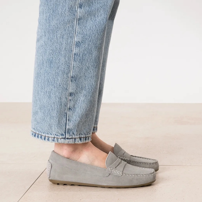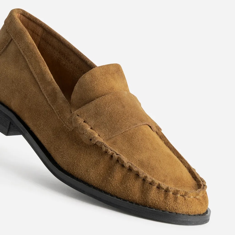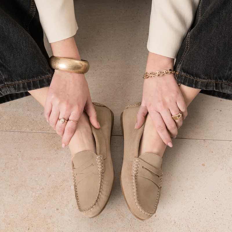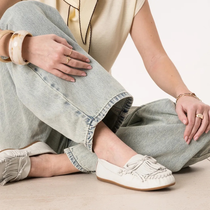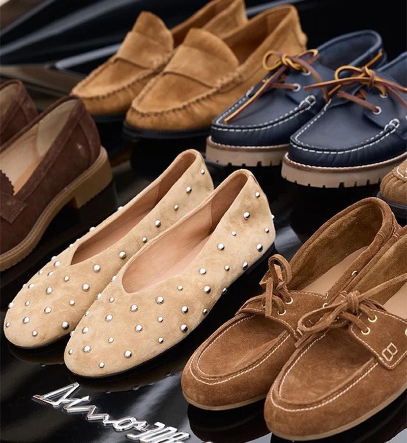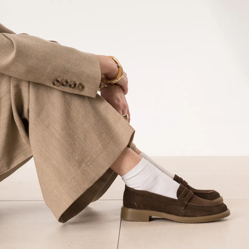 Les mocassins, essentiels de route — Héros de la collection, le mocassin multiplie les caractères. Version bord cranté en cuir velours pour une allure moderne, patte frangée pour une note heritage, ou mocassin souple en cuir lisse pour le confort continu. Les teintes camel et chocolat allongent la jambe, l’écru éclaire un denim, le noir structure une tenue tailoring. Pointe affinée ou ronde, empeigne lisse ou texturée: la ligne reste nette, agile, urbaine. À porter nu-pied, avec chaussettes fines ou collants côtelés. Le bon pairing: cabas suédé ton sur ton et ceinture cloutée minimaliste.