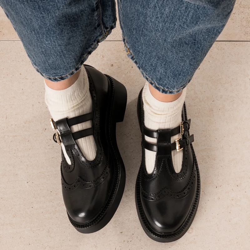 Ballerines & babies, le glamour précis — Les ballerines cloutées insufflent un éclat graphique, parfait du matin au soir. Les babies à bout carré en cuir velours camel ancrent la tendance rétro-chic avec bride ajustable et silhouette stable. En noir, un derby babies aux détails perforés réécrit le vestiaire preppy avec mordant. Les finitions cousues, semelles confort et cambrures maîtrisées signent une démarche assurée. Côté styling: jupe midi fluide, jean droit cropped, tailleur jupe ou pantalon. Un foulard léopard en touche et l’équilibre est trouvé: féminin, affirmé, sans esbroufe. • Highlight: bout carré, clous, perforations.