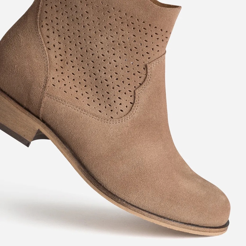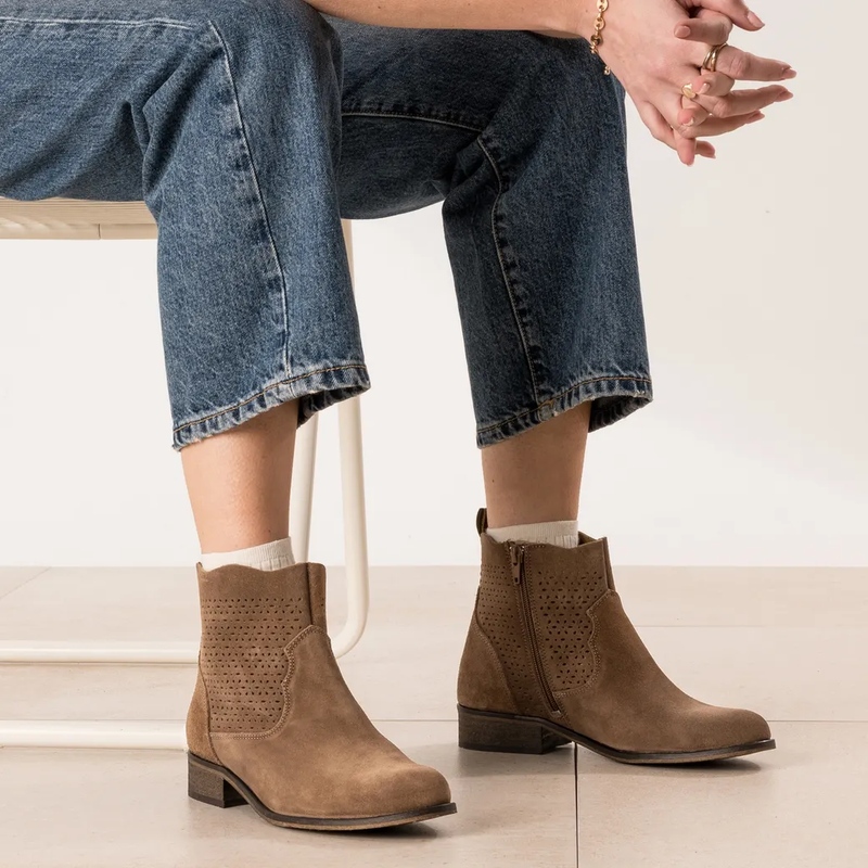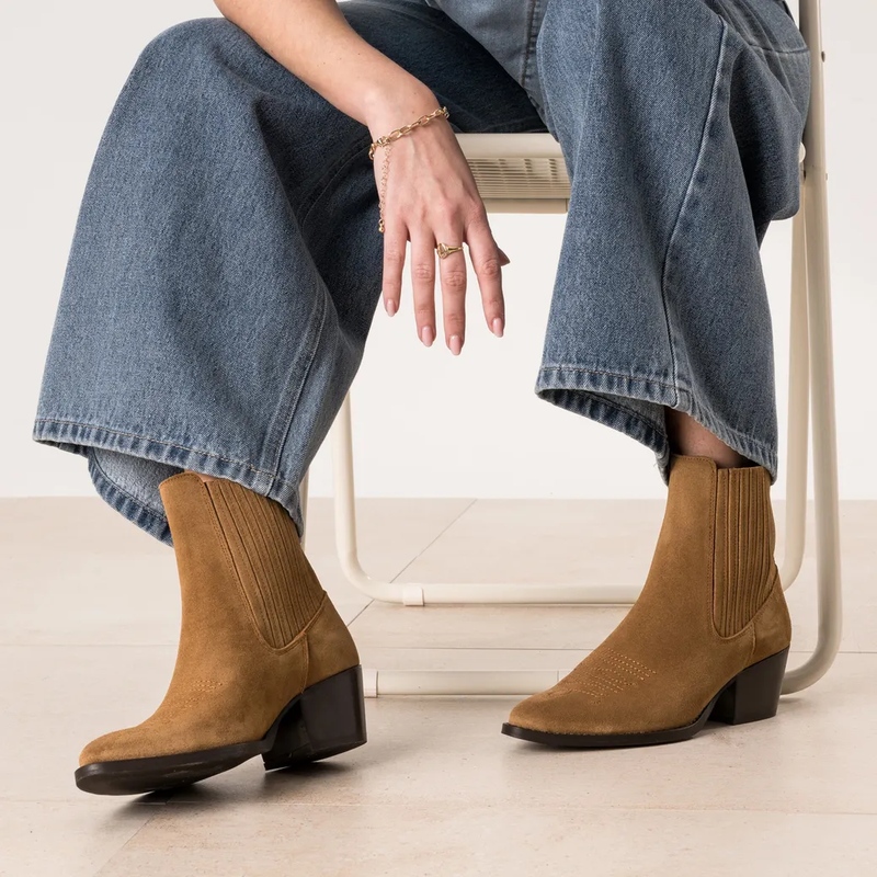 Boots & chelsea, la structure — Pour asseoir la silhouette, place aux chelsea boots en cuir velours camel, aux lignes épurées et élastiques gainants. Variation caractère: la chelsea santiags, pointe affinée et talon biseauté, injecte une énergie western citadine. Les boots à talon taupe — parfois ajourées — mixent douceur suédée et stabilité, parfaites avec trench ou blazer. Beige poudré, taupe fumé, camel solaire: la gamme sculpte des verticales élégantes. Parenthèse casual chic: la chaussure-bateau marine en cuir accompagne les week-ends en jean brut et pull torsadé. • Détail clé: tiges ajourées et talons confort.