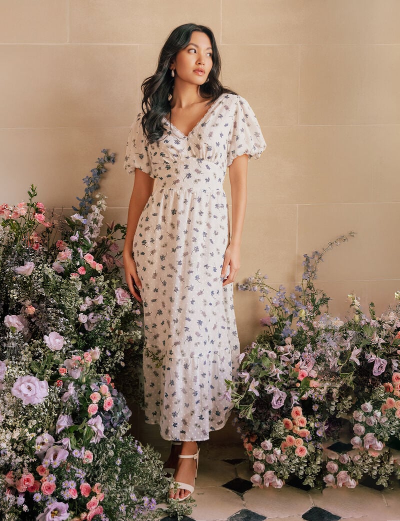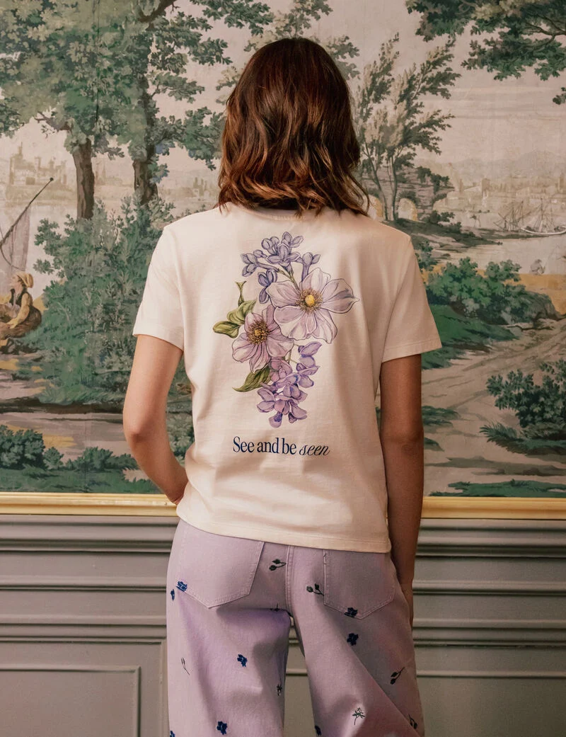 Au cœur de l’histoire, les matières multiplient les belles textures. Matières: popeline de coton, satin de viscose, mousseline, dentelle, broderie anglaise, plumetis. Les finitions soignent le confort: doublures légères, smocks élastiqués qui épousent sans serrer, rubans à nouer, boutons nacrés. Les jeux de transparence restent dosés, pour suggérer sans dévoiler. On retrouve de petits motifs fleuris, parfois jacquardés, parfois imprimés en all-over discret. Le tombé est fluide, jamais raide, pensé pour suivre le mouvement et accompagner le rythme de la journée.