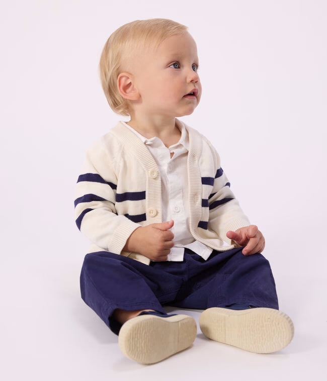 Pour les bébés, la ligne décline des robes Petit Bateau avec bloomer assorti, des ensembles deux pièces et de craquantes salopettes courtes. Les rayures marines, le blanc intemporel et les micro-fleurs donnent le ton. Les cardigans en coton se glissent par-dessus sans alourdir, parfaits quand la brise se lève. Côté détails, col marin ou col vareuse, boutonneries sages et volumes confort. On retrouve aussi polos et tee-shirts à petits motifs, plus des capelines coordonnées. Les tailles couvrent du 3M au 36M pour suivre chaque étape, avec douceur assurée.