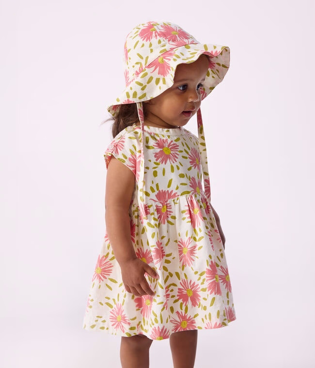 Question style, on assemble une robe en popeline avec un cardigan léger, ou un short en coton/lin avec tee-shirt blanc pour un look droit et net. Les capelines protègent sans gâcher la tenue; les chaussettes ou collants peau finissent proprement. Motifs fleuris pour la fantaisie, rayure marine pour la modernité, total look blanc pour la solennité. Les prix démarrent autour de 19€ pour certains tee-shirts, 25€ les capelines, et montent jusqu’à 80€ pour quelques robes plus travaillées. Des options pour chaque budget, sans renoncer au style.