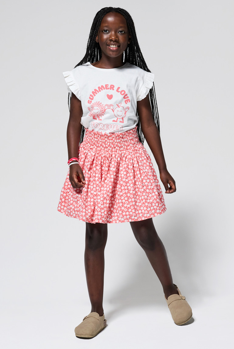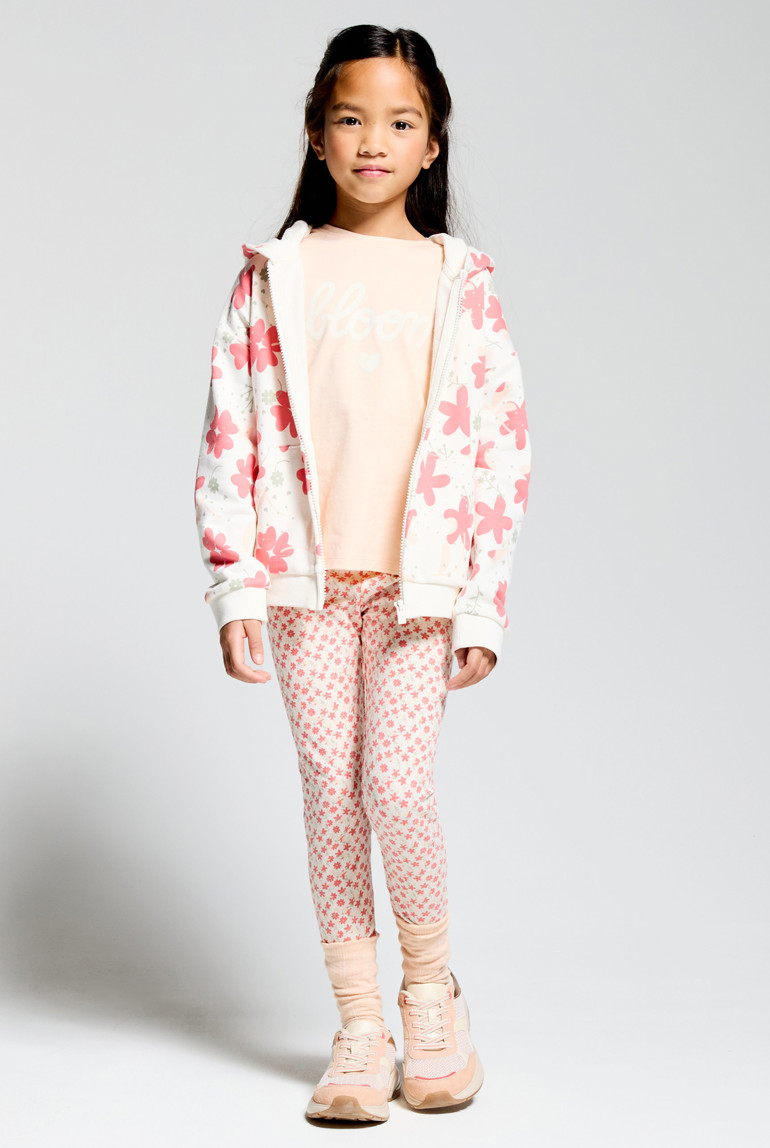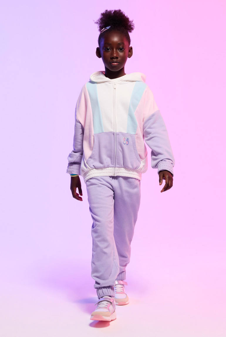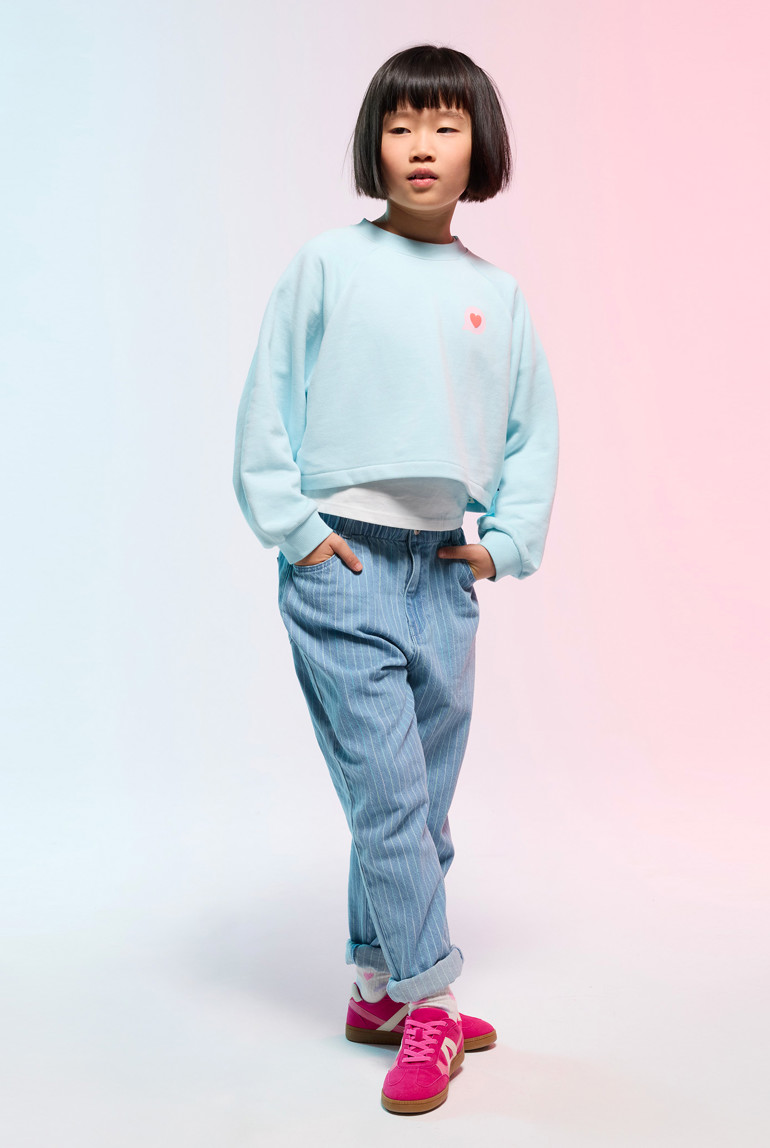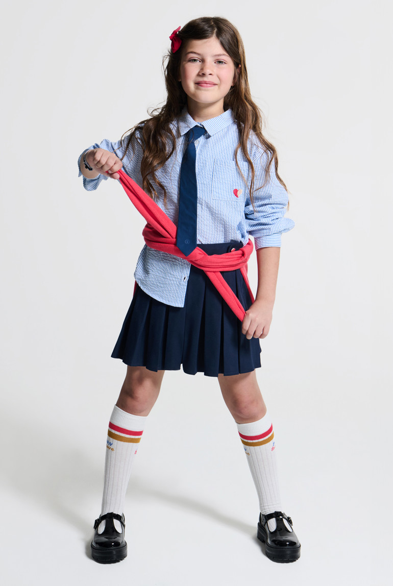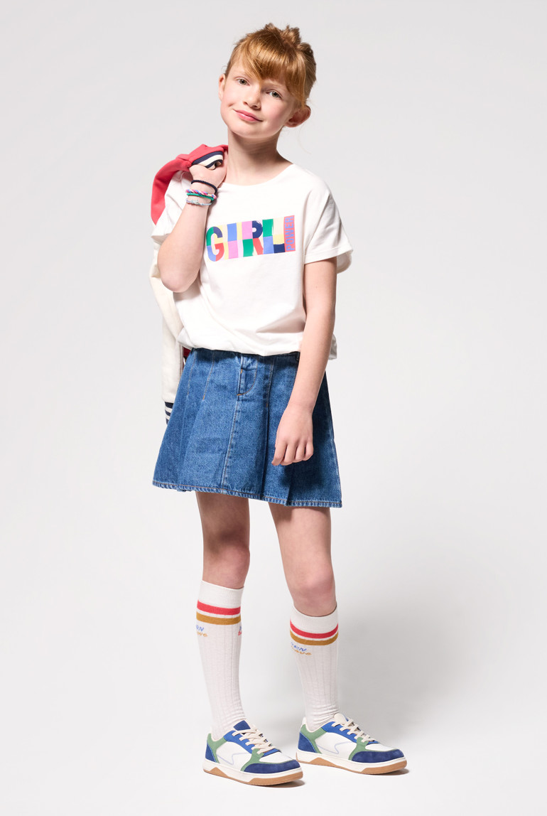 La couleur mène la danse avec une palette & imprimés réjouissante. Pastels cocoon (blush, lilas, menthe) croisent des accents vifs (corail, fuchsia, citron). Les neutres chic – marine, écru, camel – apaisent l’ensemble, tandis que quelques touches métalliques dorées ou argentées apportent l’éclat. Côté motifs: fleurs fines, vichy, rayures marinière, pois espiègles, petits cœurs et messages positifs. Tout se mixe facilement: une jupe lumineuse, un sweat doux, des baskets blanches, et l’allure prend forme, naturellement. Sans effort, sans faute de goût, assumée.