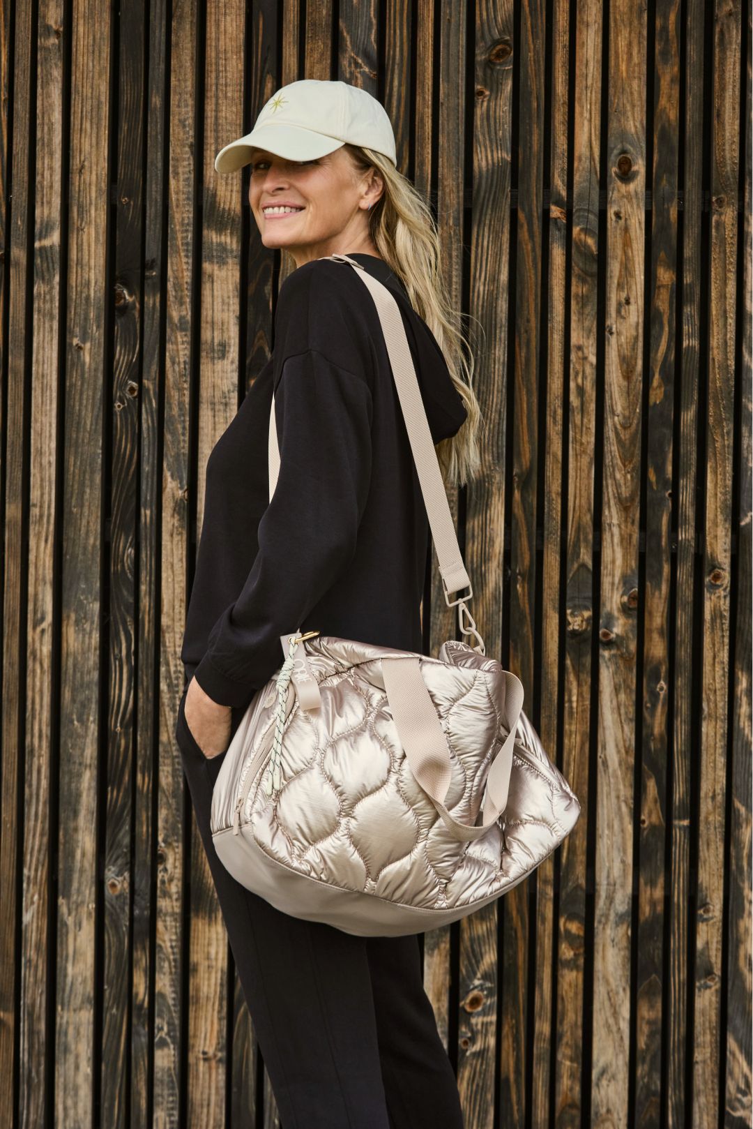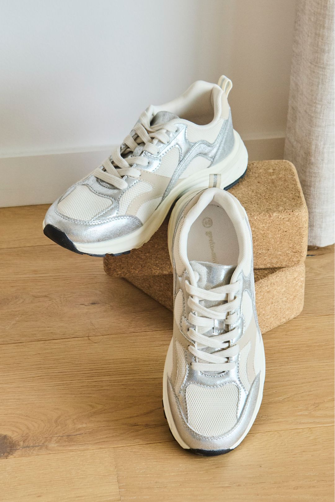 Les accessoires signent le twist mode. Les baskets argentées illuminent l’ensemble: effet métallisé discret, semelle souple et amortissante, parfaites pour marcher longtemps sans renoncer au style. Le sac de sport matelassé est léger, protecteur, avec anses confort, bandoulière et poches pour l’essentiel. Côté tête, la casquette brodée ajoute une note cool et protège au soleil. Et le lot de chaussettes finalise le confort, bord qui ne serre pas, maille douce. Palette sobre rehaussée d’un éclat silver: juste ce qu’il faut pour réveiller les basiques. Pratique, chic, sans prise de tête.