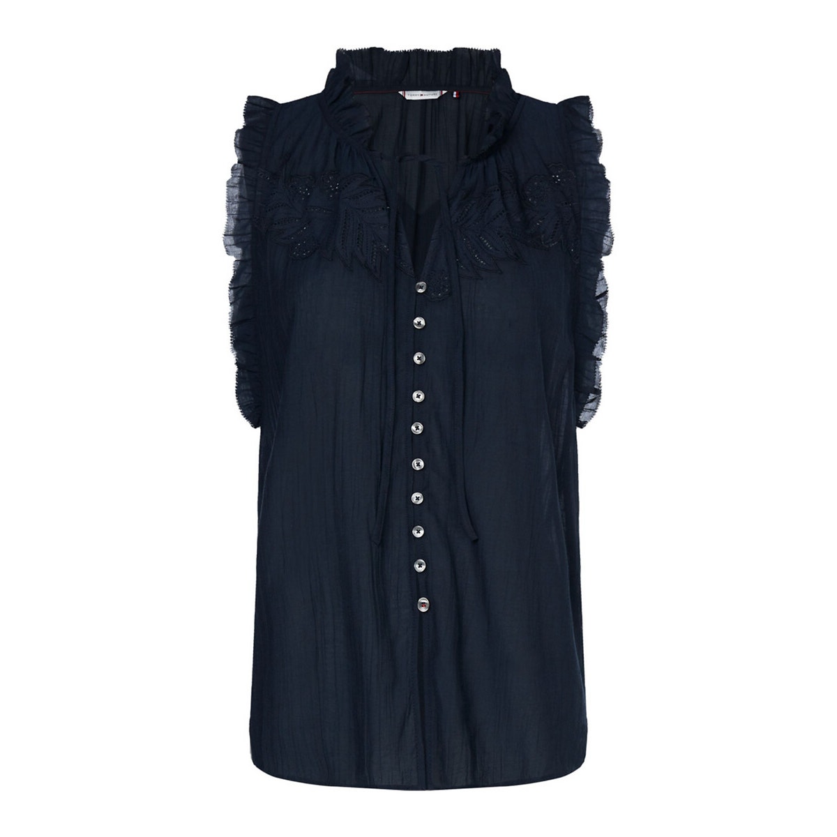 La blouse sans manches pour femme TOMMY HILFIGER. Jeu de volants, broderies et effet froufrou pour ce top sans manches fermé par bouton.Détails produit Sans manches Coupe droite Col montantComposition et Entretien 55% viscose, 45% coton Pour l’entretien, merci de vous référer aux indications figurant sur l’étiquette du produit