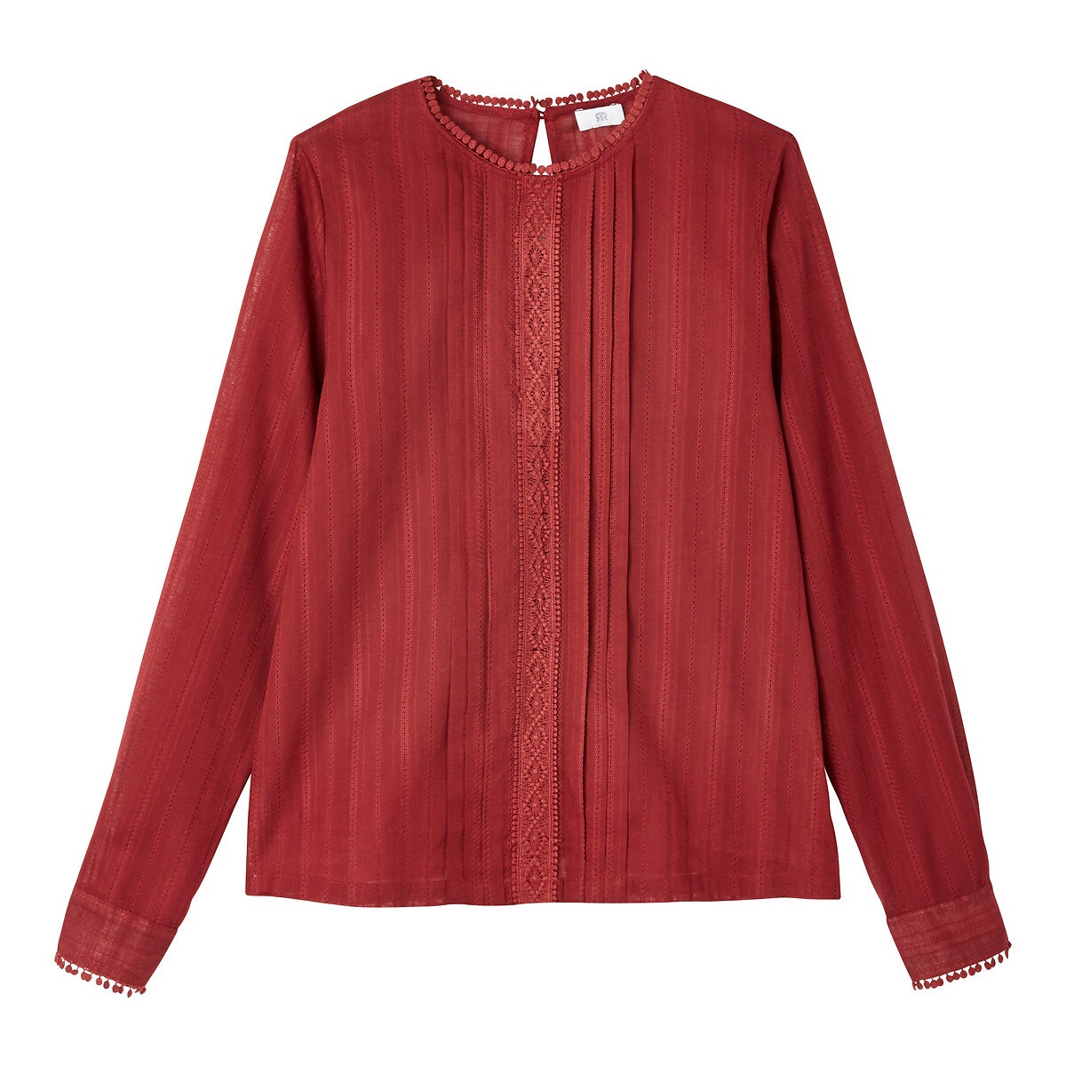 Coup de cur pour cette blouse style romantique, très raffinée et pile dans la tendance. Cette blouse apporte une touche de chic au denim, féminise la silhouette et peut aussi se porter plus habillée.Détails produit Manches longues Coupe droite Col rondComposition et Entretien 100% coton Température de lavage 30° cycle délicat Température de repassage moyenne / blanchiment interdit Ne pas sécher en tambour Pas de nettoyage à secEn savoir plus : Col rond, fermé par goutte d’eau boutonnée au dos Jeu de plis et bande en macramé milieu devant Manches longues, poignets boutonnés Longueur 62 cm en taille 38