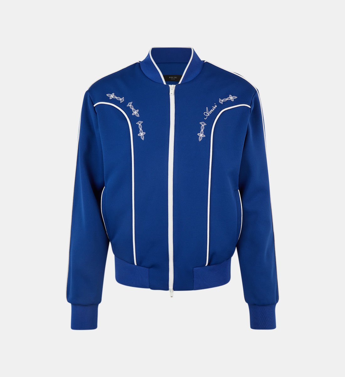 Ce blouson court Amiri orné de broderies signatures et de détails contrastés, présente un col banane, une fermeture à glissière ainsi que 2 poches passepoilées.