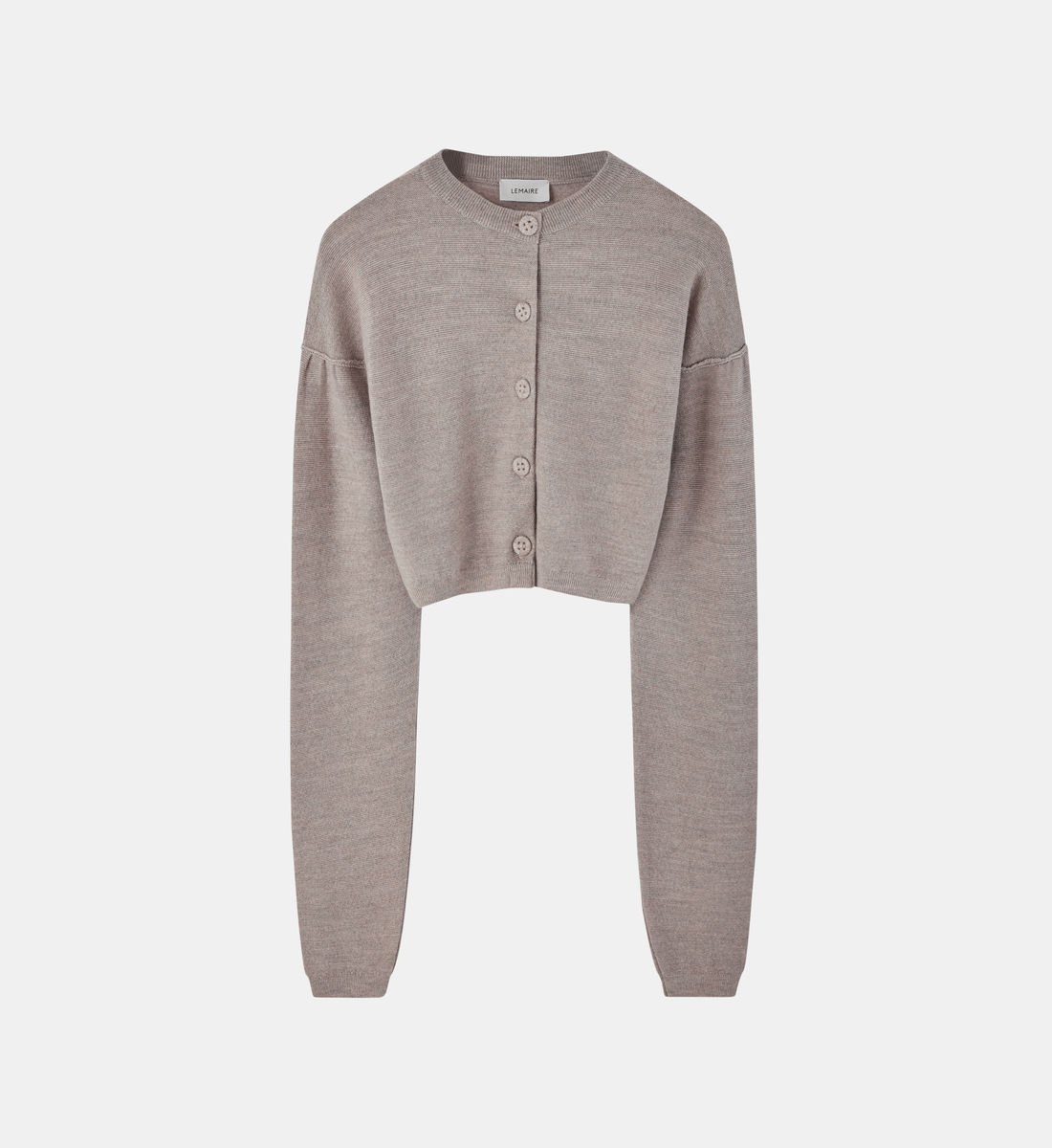 Ce cardigan Lemaire à la coupe courte est conçu en mélange de laine mérinos. Il est doté d’un col rond suivi de boutons en ton sur ton et présente des plis au niveau des épaules.