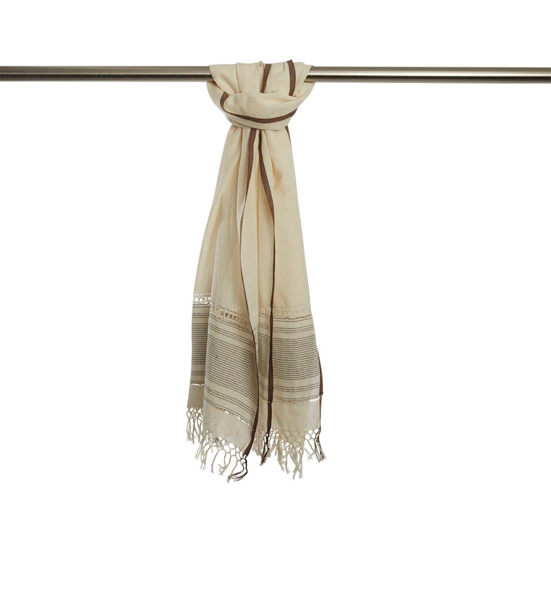 Ce foulard en pur coton présente des jours échelle et des broderies lignées tout en finesse. Un indémodable à coup sûr.