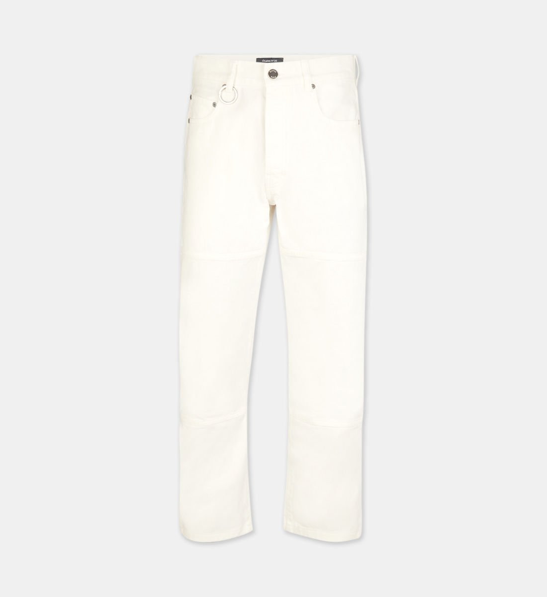 Ce jean droit Etudes en coton biologique est muni de poches, d’une fermeture boutonnée et d’un anneau signature.