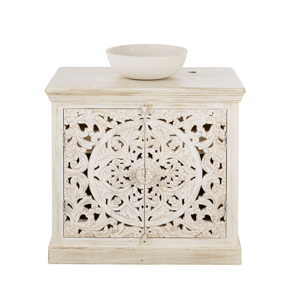 Votre salle de bains part dans des contrées lointaines avec le meuble vasque en manguier massif sculpté blanc effet vieilli KERALA . Rendant hommage à l’artisanat indien avec ses portes blanches en manguier sculptées à la main, il saura tout de suite se faire remarquer dans votre pièce d’eau. On craque aussi pour sa vasque en résine effet béton coloris crème qui finalise ce meuble de salle de bains tout en lui offrant une touche contemporaine. N’hésitez pas à l’associer à un miroir en bois, en fibre de coco ou en rotin pour jouer la carte exotique jusqu’au bout.