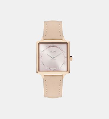Cette montre Amalys se compose d’un boitier carré de 25mm en acier doré rose, d’un cadran rose et d’un bracelet en cuir rose. Etanchéité 30M. – Référence fournisseur : AMW-020