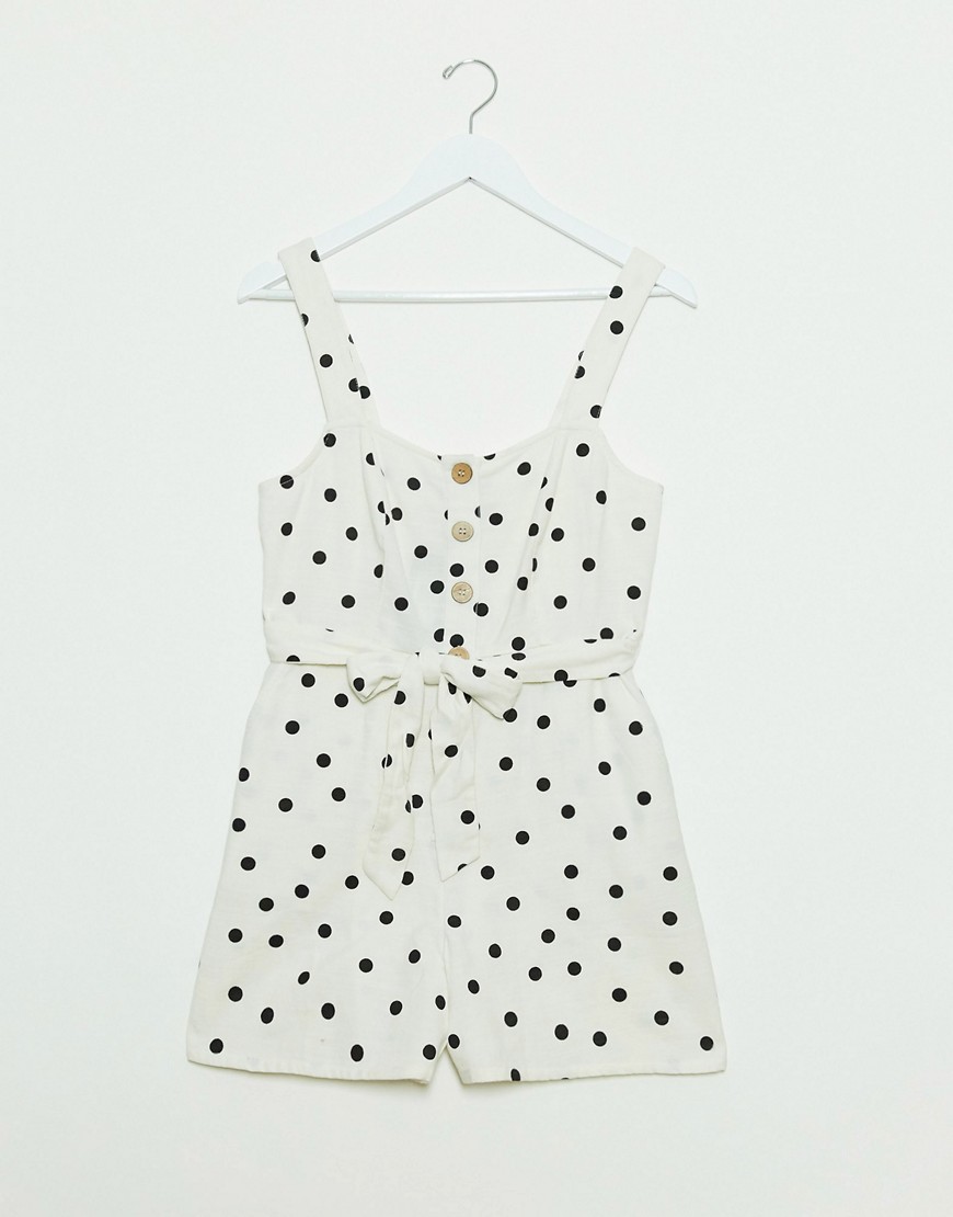 Combishort par New Look À porter partout, tout le temps Modèle à pois Encolure carrée Patte de boutonnage partielle Bretelles larges Ceinture à nouer Coupe classique Taille normalement
