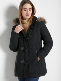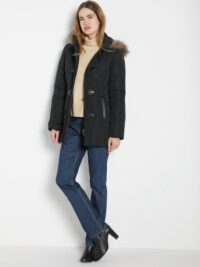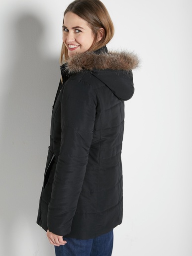 Chaudement matelassée et déperlante, cette parka courte aux détails mode vous accompagnera avec élégance tout l’hiver ! Capuche amovible par zip, bordée d’imitation fourrure (70% acrylique, 30% polyester). Zip jusqu’en haut du col montant sous patte fermée par 4 attaches en simili (100% polyuréthane) façon brandebourgs et boutons plastique. Empiècement aux épaules et découpes princesse devant et dos. Poches prises dans les découpes devant bordées d’un biais en simili. Poche intérieure boutonnée. Découpe martingale à la taille dos. Microfibre déperlante 100% polyester. Matelassage et doublure 100% polyester. Longueur 75 à 81 cm selon les tailles. Existent en grandes tailles. Chaleur ++ (chaud)Photo retouchée