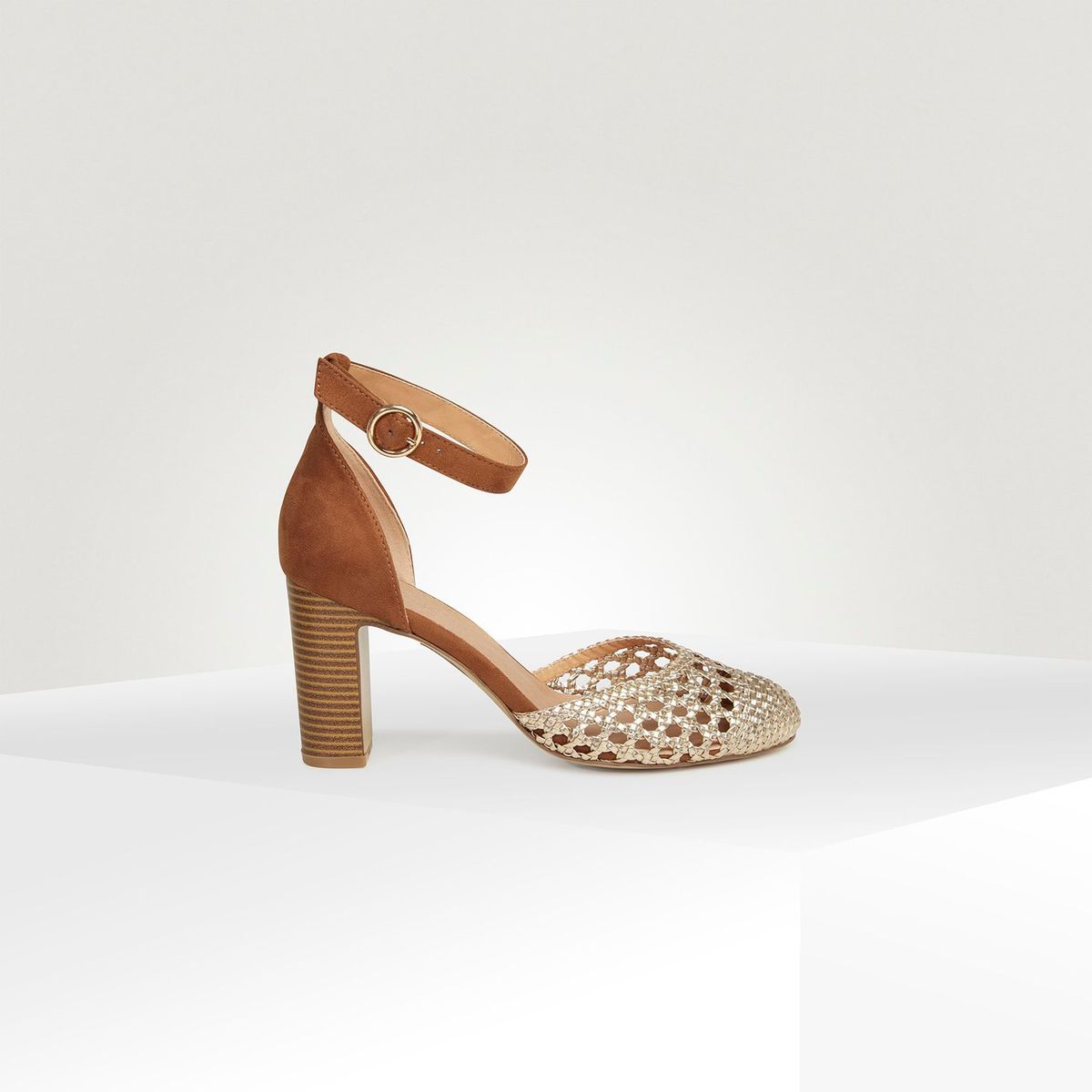 Sandales façon cuir irisé, bout rond. Détail cannage sur le bout, empiècement arrière et bride cheville façon cuir velours contrastant. Fermeture par une boucle délicate à la cheville, talon droit haut lamellé. Tout en contraste, cette paire de sandales est incontournable pour accompagner vos tenues élégantes. Portez-la avec une robe comme avec un pantalon 7/8 pour dévoiler vos chevilles. Son plus : un talon large confortable.Détails produitType : Talon largeFinition : Bout rondFermeture : A bride/boucleComposition et entretien100% POLYURETHANEEntretien facile