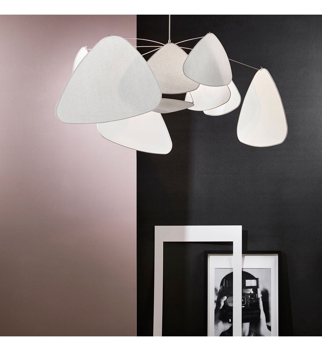 La suspension Screen Murano rappelle l’esprit du mobile. Sa structure est en métal peint avec 10 écrans en papier et dispose d’une source lumineuse, culot E27. Elle est équipée d’une cordelière textile et d’un pavillon en métal adaptable DCL. Max : 60W Dimensions : Ø110 x 45 cm