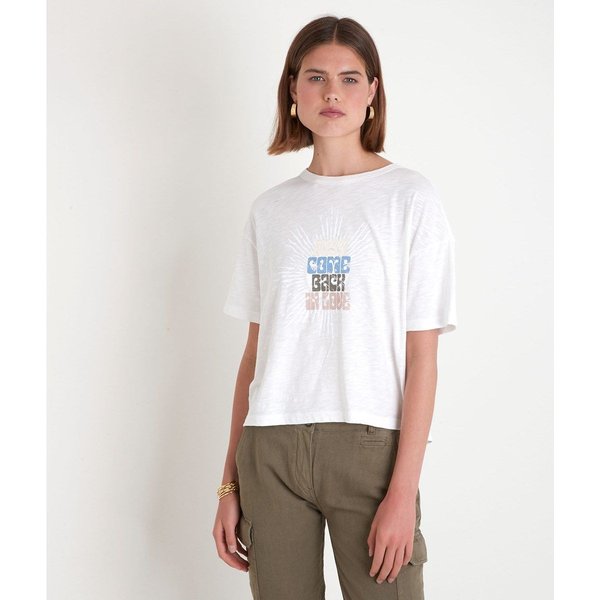 Détails produits:WECARE : Ce t-shirt est confectionné à partir de coton biologique. Cultivé avec du compost naturel, garanti sans OGM, le coton biologique ne nécessite que 9% de la consommation d’eau utilisée pour la culture du coton conventionnel. Il contribue à la conservation de la biodiversité, à la préservation de la fertilité des sols et à la réduction d’émissions de gaz à effet de serre. Plus doux et plus souple, la fibre du coton biologique est également plus épaisse. Craquez pour notre tee- shirt EQUINOXE et son allure un brin vintage. Confectionné en coton biologique, sa coupe est loose, son coloris blanc est légèrement chiné et il arbore un message à la typo très seventies. A l’esprit d’un tee- shirt qui aurait traversé les années, on l’ajoute à sa collection et il ira avec tout ! – 100% coton biologique – manches courtes – col rond – coupe large – message imprimé – pièce fabriquée en Turquie Olivia mesure 1m82 et porte une T.36. Avec le tee- shirt EQUINOXE, la mannequin porte le pantalon FALOU, la ceinture SHARLEEN et les boots HEGLANTINE.Composition détaillée:• Matière Principale : 100 % Coton bioEntretien:• Lavage 30 ° délicat• Pas de blanchiment• Repassage doux• Pas de séchage en tambour ménager