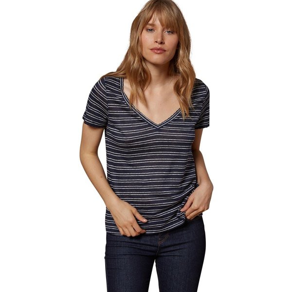 Belle matière, encolure gracieuse, douce fluidité. Pour faire simple, ce T-shirt s’adapte à toutes les situations. Détails Finition festonnée à l’encolure V devant et aux manches courtes. Base droite. Longueur 62 cm environ. Matière Maille jersey 100% lin. Textile naturel le plus respectueux de l’environnement et matière légère par excellence, le lin est très agréable à porter. Résistant, il devient plus beau et plus souple au fil des lavages… Parfait pour garder son T-shirt préféré plus longtemps !