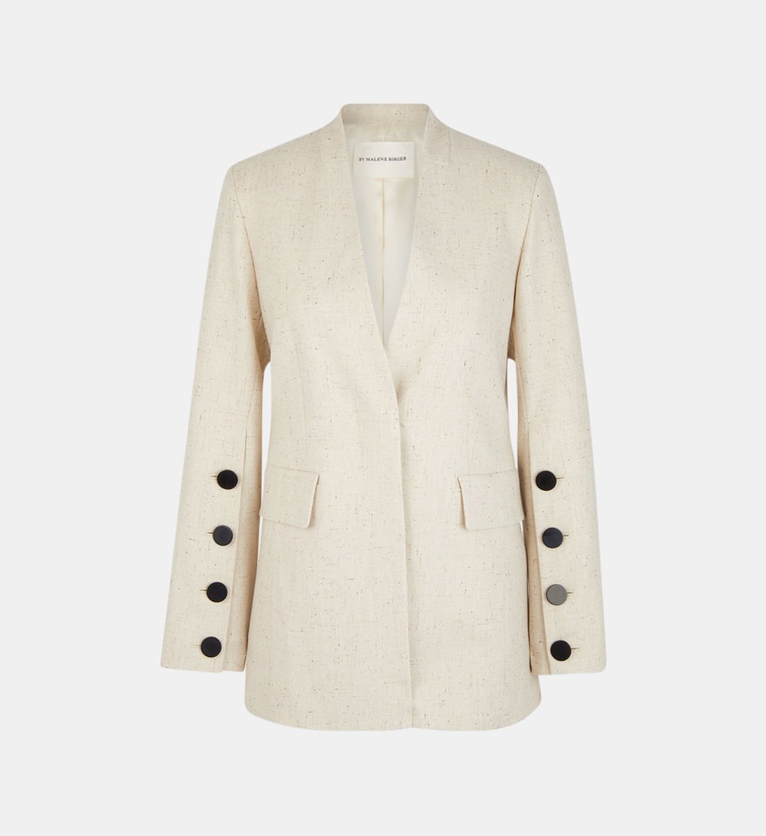 Cette veste blazer By Malene Birger mouchetée et sans col est munie d’une fermeture à un bouton, de poches, d’une fente d’aisance au dos et d’une doublure.