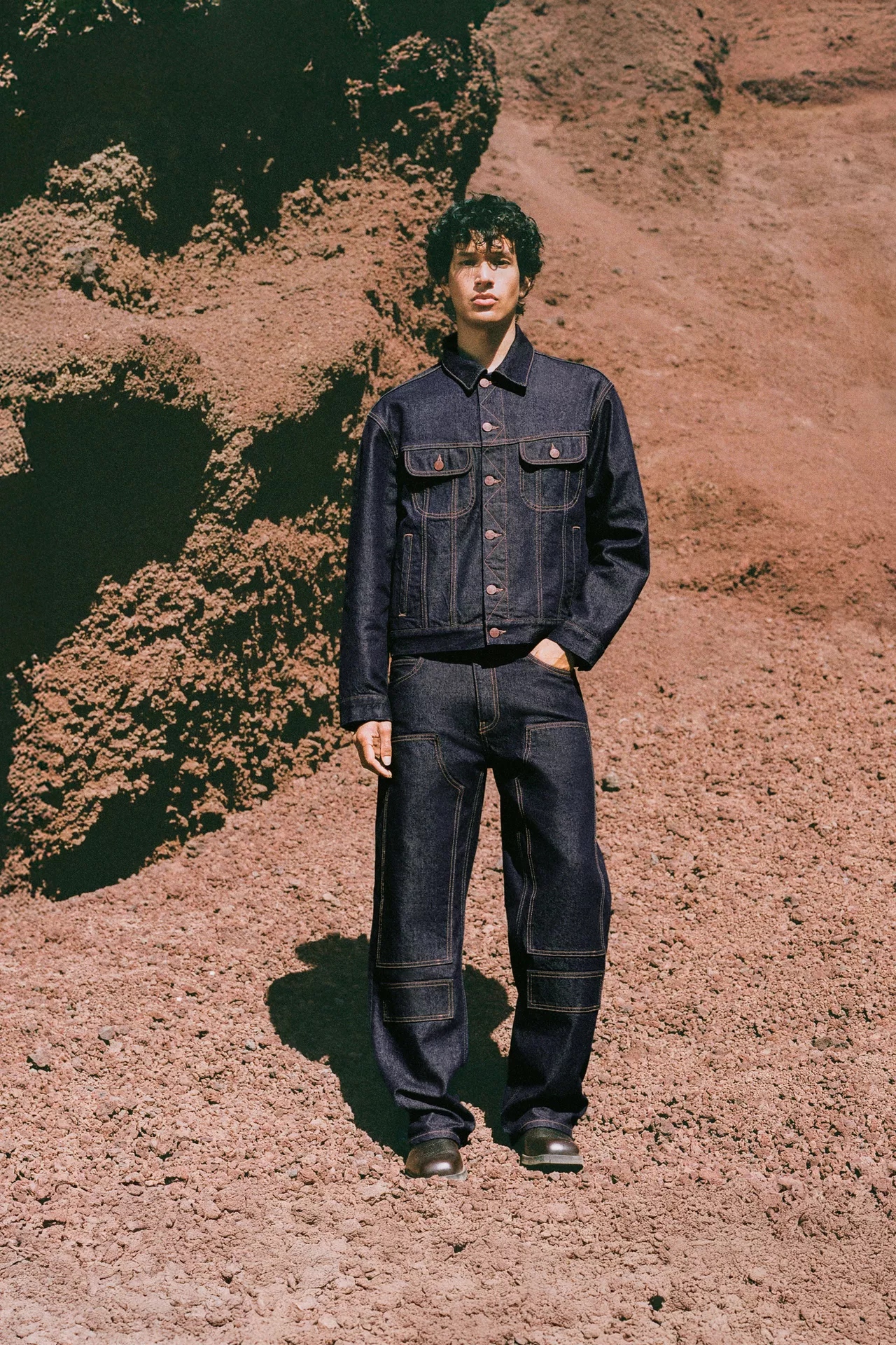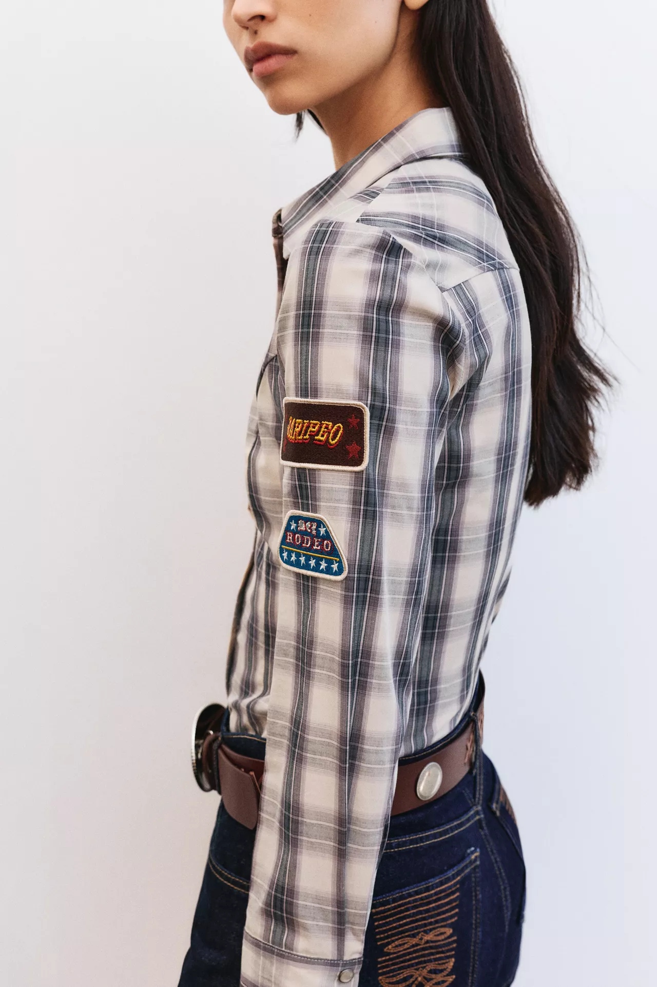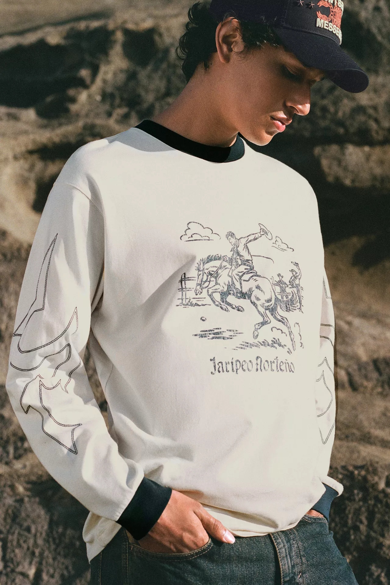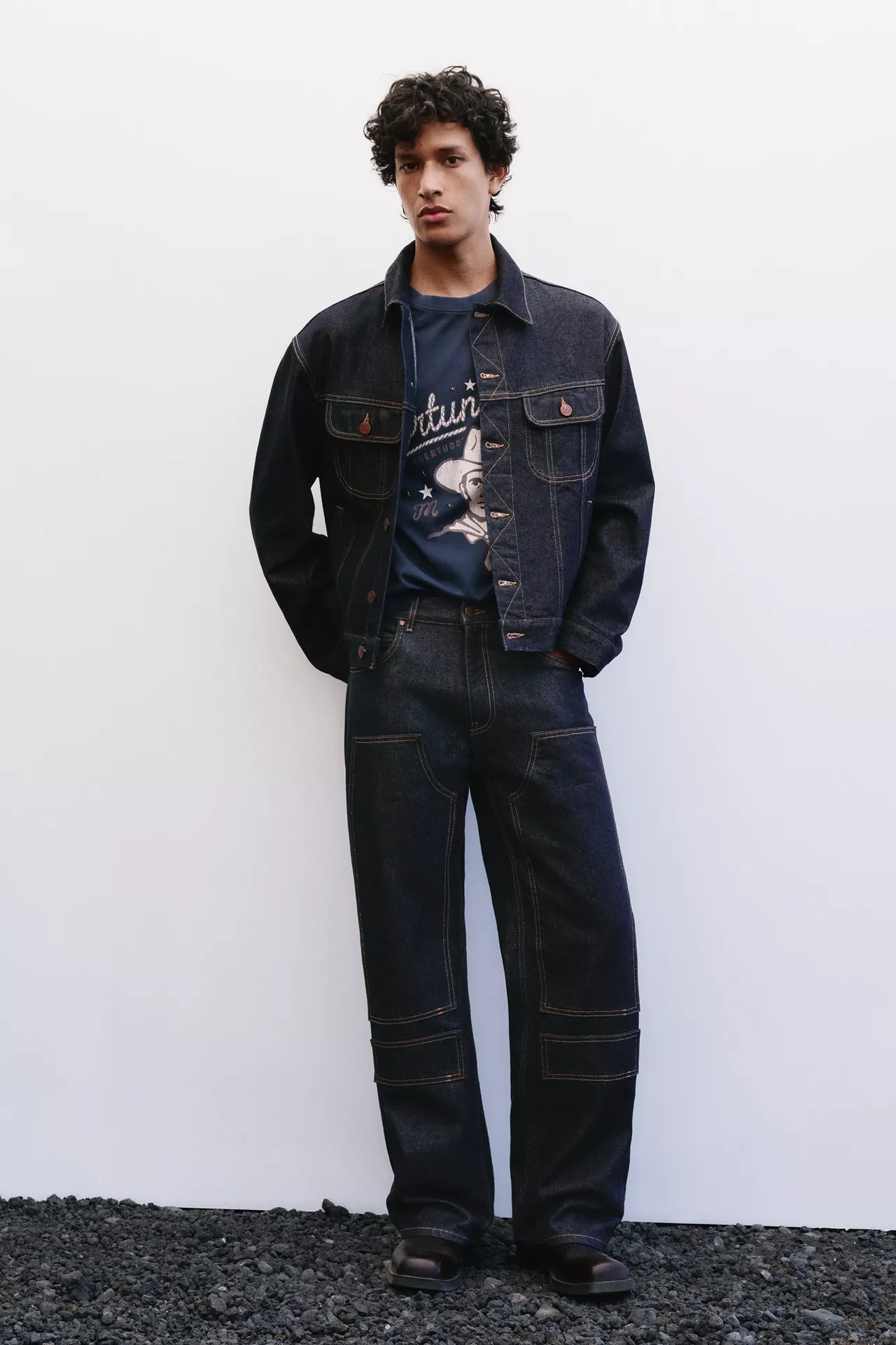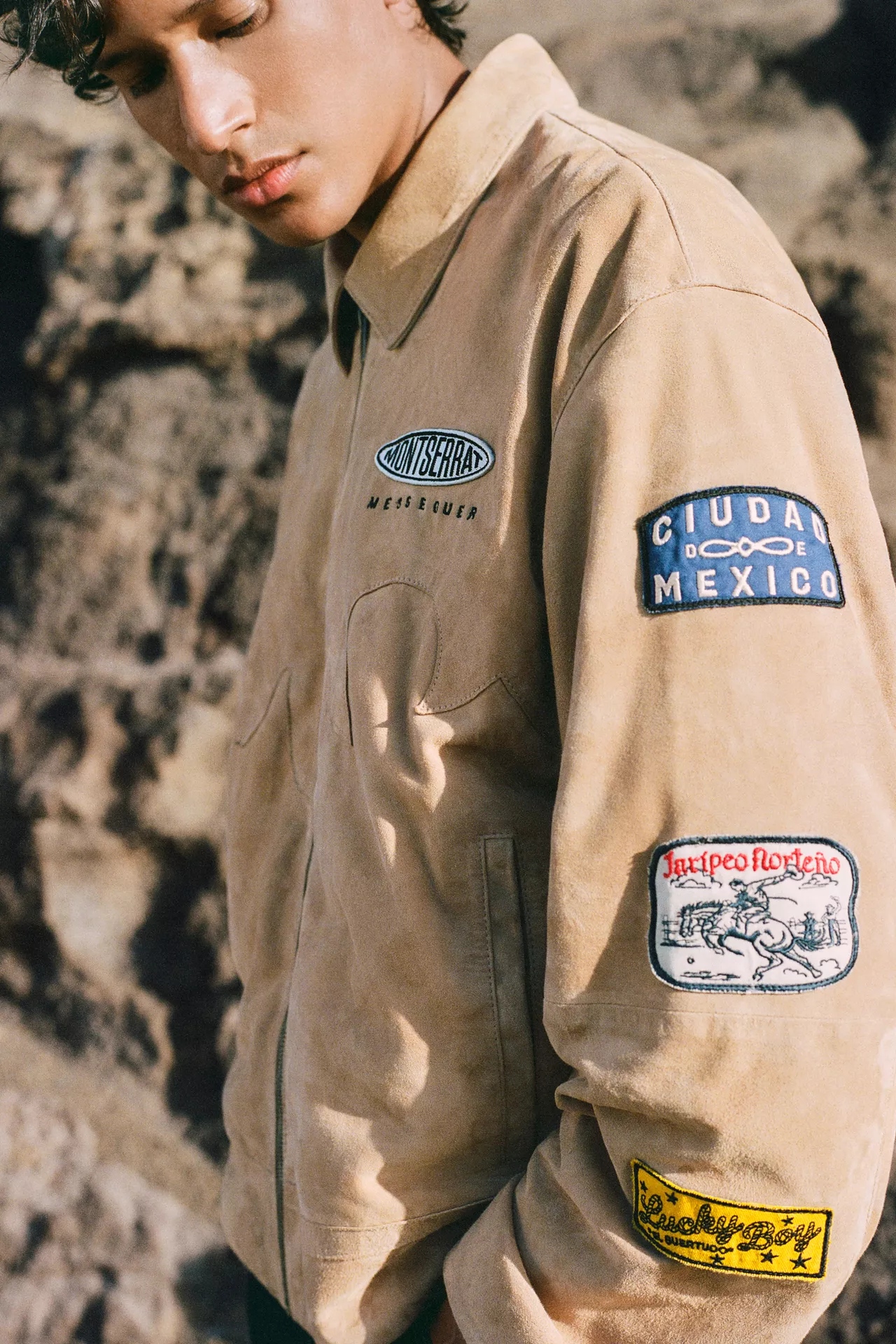 Au cœur de la collection, des matières respirantes et tactiles. Le denim en coton domine, décliné du brut au délavé clair. Popeline ferme pour les chemises, jersey compact pour les t-shirts, suédine souple et faux cuir lisse pour les pièces d’accent. Les doublures restent légères pour garder de l’aisance. Boutons pression, œillets et boucles métal ajoutent du relief. Les surpiqûres contrastées structurent les silhouettes, tandis que des broderies inspirées des costumes charro signent les détails, sans alourdir. Tout se mélange, se lave, vit.